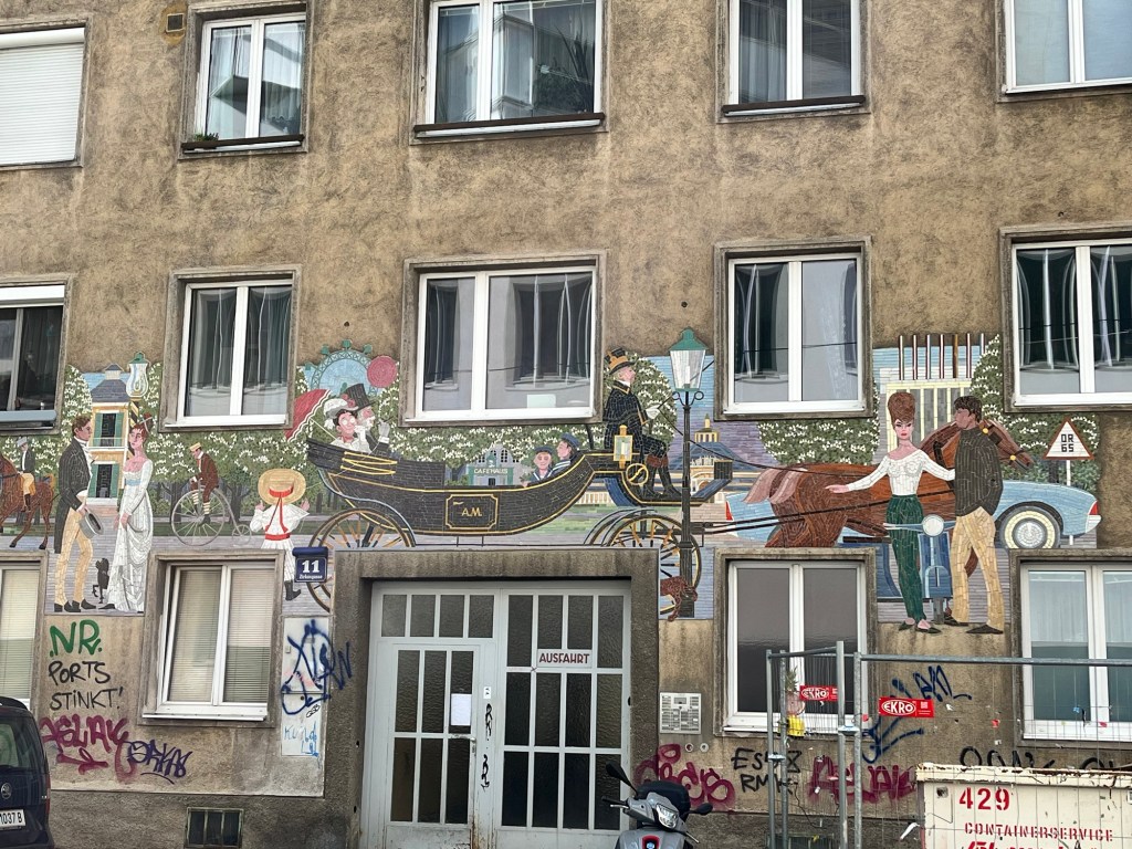 In der Leopoldstadt wie auch am dortigen Donaukanal warten so einige kleine Geschichten auf euch, unter anderem findet ihr noch ein Bild auf einer Hauswand, welches die Adeligen im Prater zeigt.