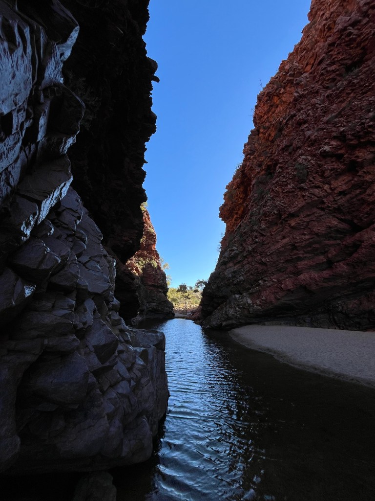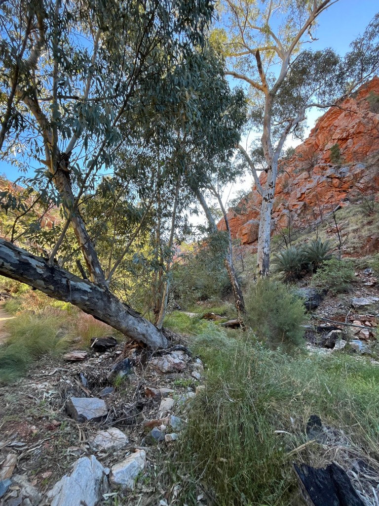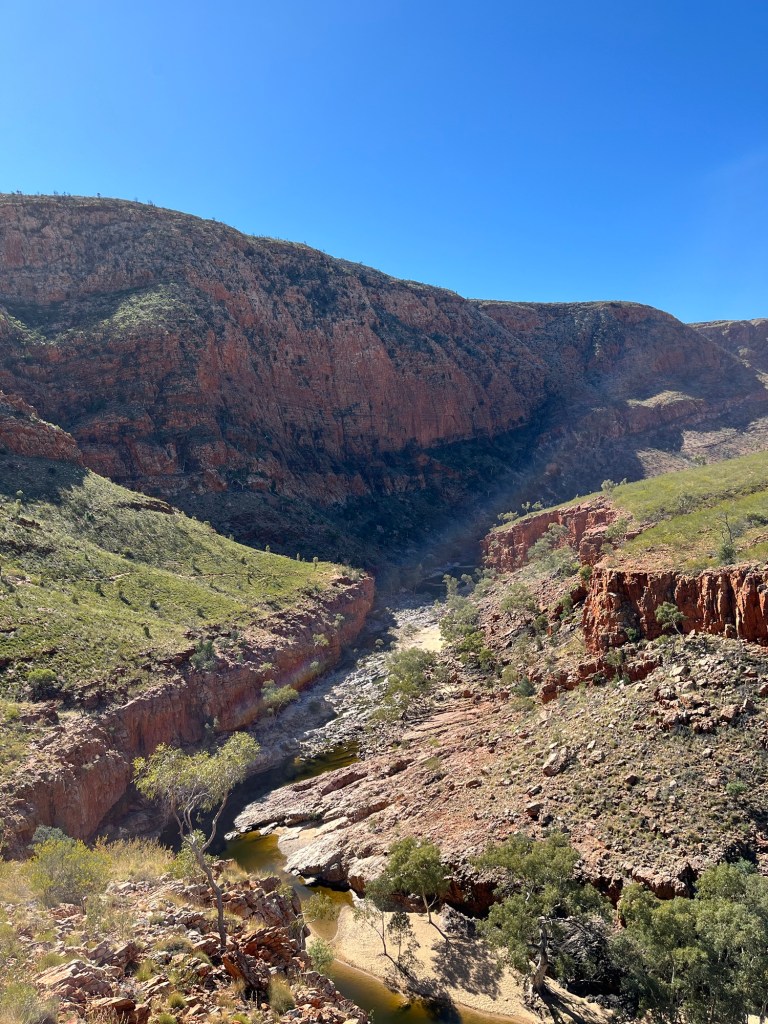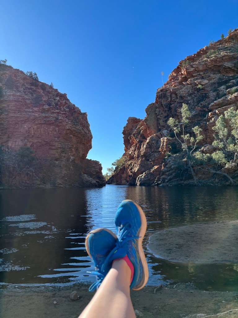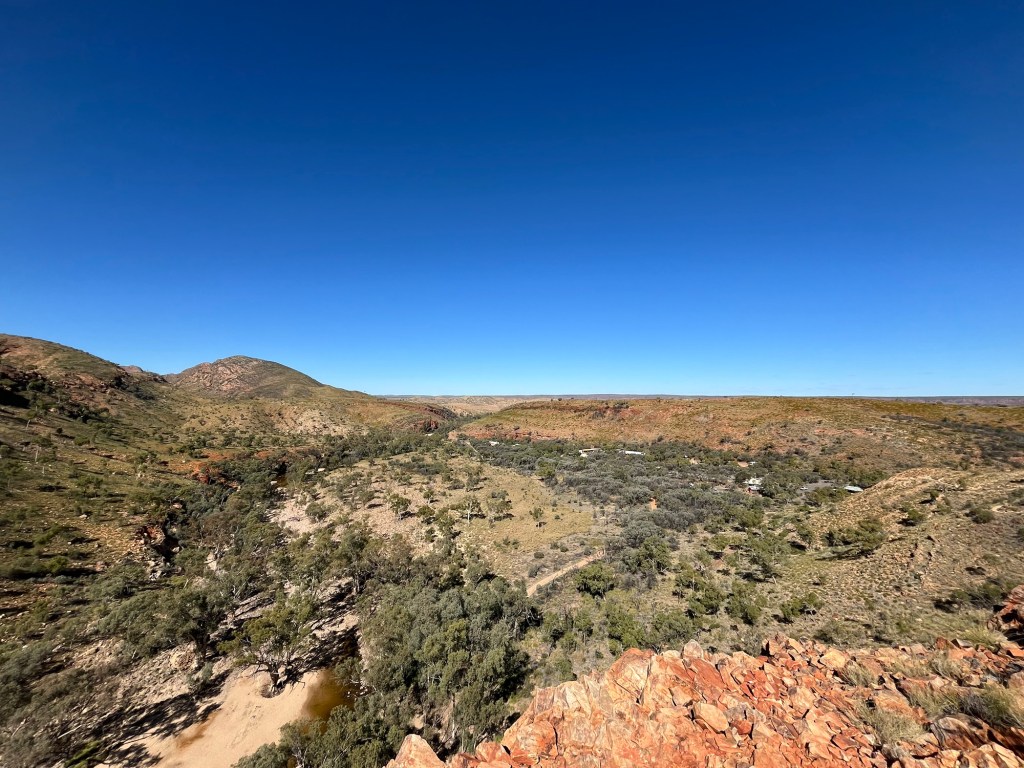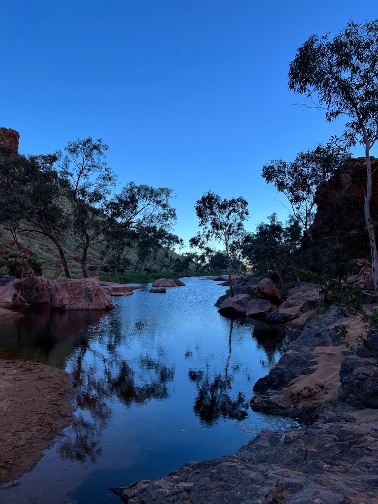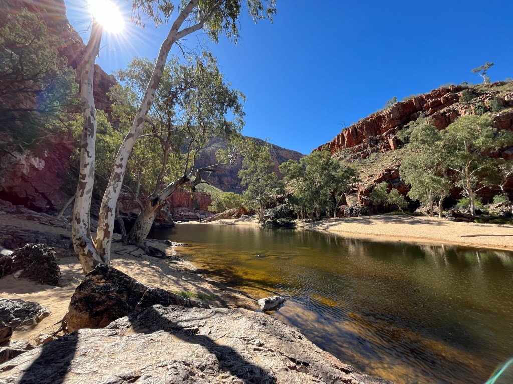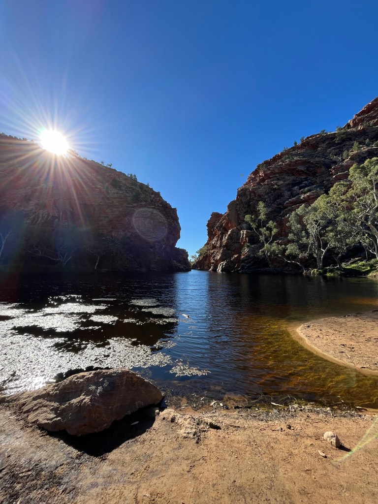 Gegen 14:45 ging es dann weiter zurück Richtung Alice, zunächst zum Ellery Creek Waterhole, das war eine gute 1/2h weit weg. Bei wärmeren Temperaturen wäre das bestimmt mega gewesen zum Schwimmen, so war es uns aber allen etwas zu kühl. Der Ausblick ist aber trotzdem mega, es gibt ganz viele Vögel zum Beobachten und es war ein wirklich schöner Spot.