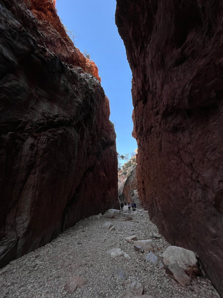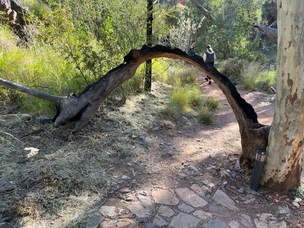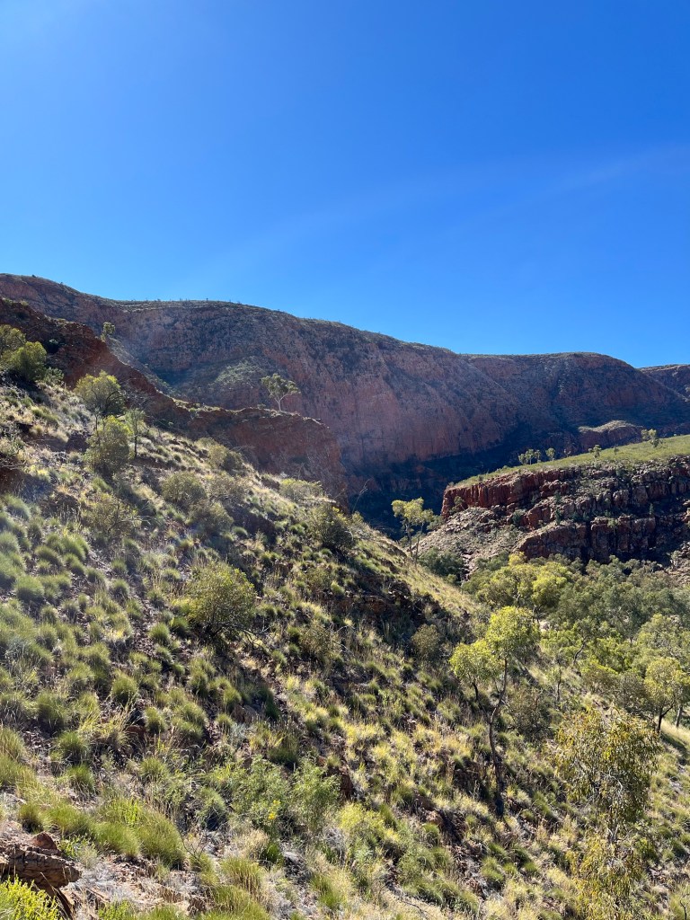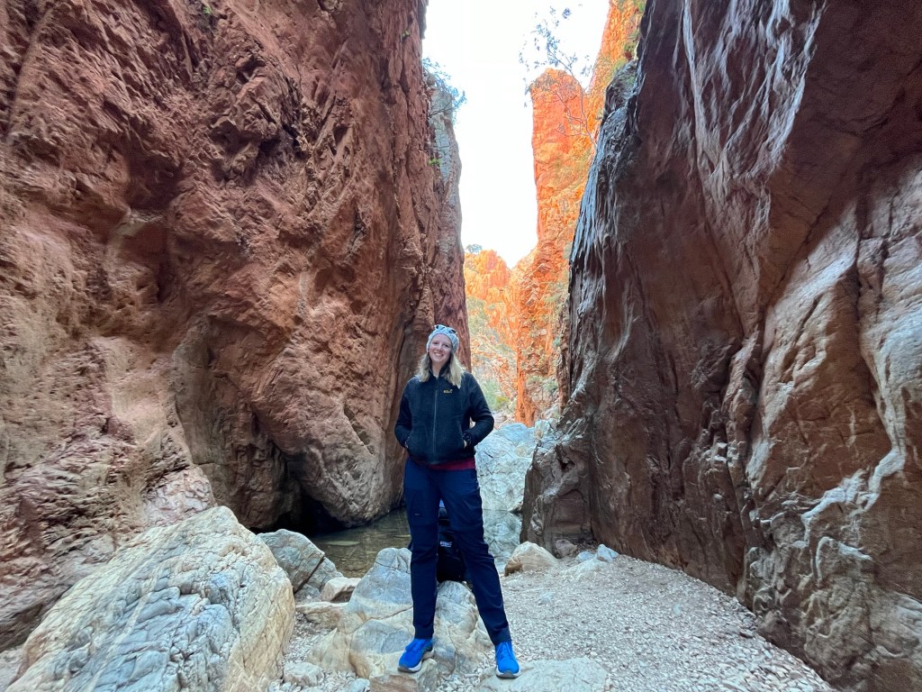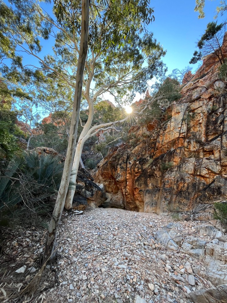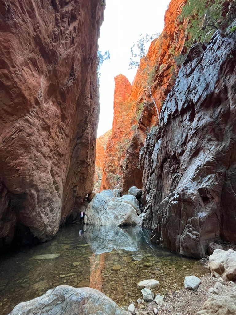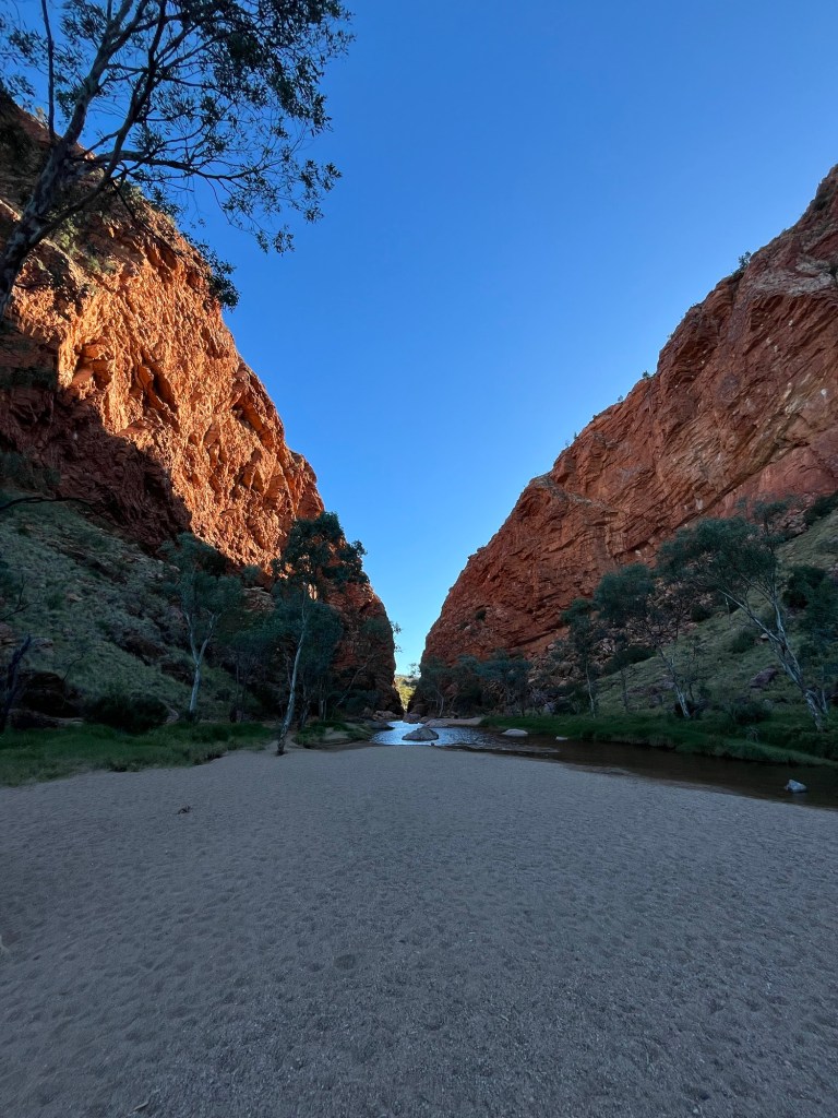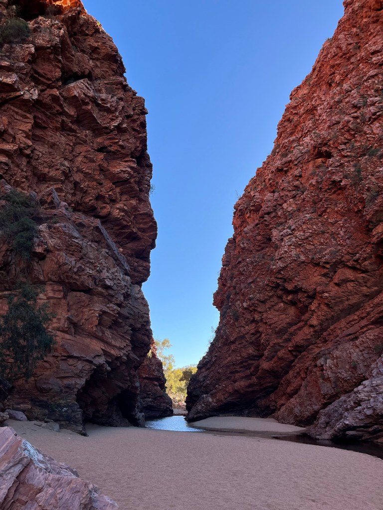 Gegen 14:45 ging es dann weiter zurück Richtung Alice, zunächst zum Ellery Creek Waterhole, das war eine gute 1/2h weit weg. Bei wärmeren Temperaturen wäre das bestimmt mega gewesen zum Schwimmen, so war es uns aber allen etwas zu kühl. Der Ausblick ist aber trotzdem mega, es gibt ganz viele Vögel zum Beobachten und es war ein wirklich schöner Spot.