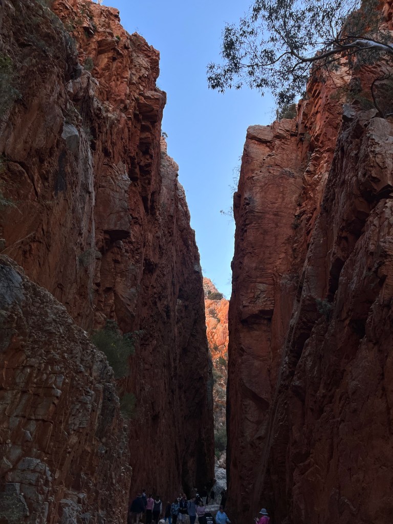 Weiter ging es von der Simpsons Gap zum Standley Chasm, einem Ort, welcher nach einer europäischen Lehrerin von Alice Springs benannt war, die sowohl europäische als auch aboriginee Kinder unterrichtet hat. Man läuft gute 15 Min durch das Flusstal, bevor man in der Schlucht ankommt. Vor uns war ein ganzer Rentner Bus, habe bissl gewartet, bis die alle aus der Schlucht verschwunden sind, dann war es viel schöner. Zurück beim Bus gab es dann eine Morning Tea & Coffee Break mit Kecksen, Kuchenstücken & Getränken.