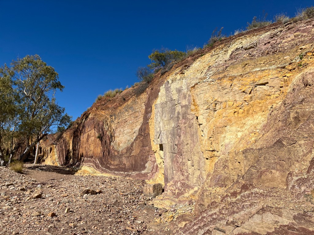 Nach circa 50 Minuten Fahrt waren wir bei den Ochre Pitts, wo früher Ocker von den Aboriginees abgebaut haben für Gesichts- & Felsenmalerei. Heute wird das nicht mehr genutzt, daher kann man es ganz schön besichtigen.