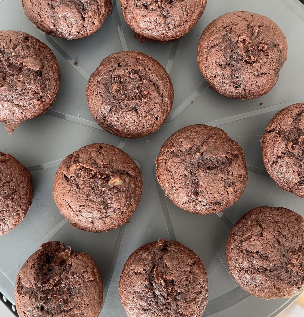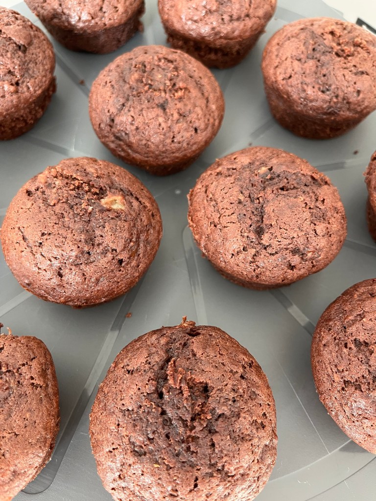 Nun müssen die Muffinformen nur noch gefüllt werden – die Menge ergibt zwischen 12 bis 18 Muffins je nach Größe der Bananen, die du verwendet hast. Die Muffins werden dann bei 160 Grad Umluft für 20 bis 25 Minuten gebacken, mit einem Messer oder Stricknadel einen Muffin einstechen, ob noch Teig dran klebt, ansonsten sind sie fertig.